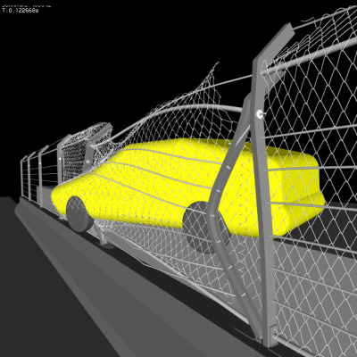 sonar-3D simulation of a debris fence as used along borders of racing circuits to protect spectators. The impact was numerically simulated with sonar software in a very high level of detail. The element resolution of the wire-material was in order of magnitude of 100’000 objects.